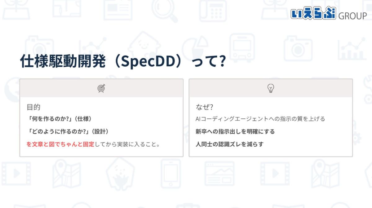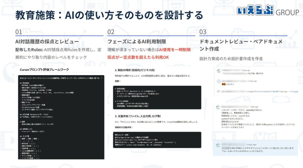 特に、AIに頼りきりにならない人材を育成するため、「スペック駆動の開発」と「コーディングエージェントの利用評価」という2つの具体的な施策を紹介。新人がAIの出力に責任を持てるよう、AIとの対話そのものを評価する仕組みを導入していると語りました。