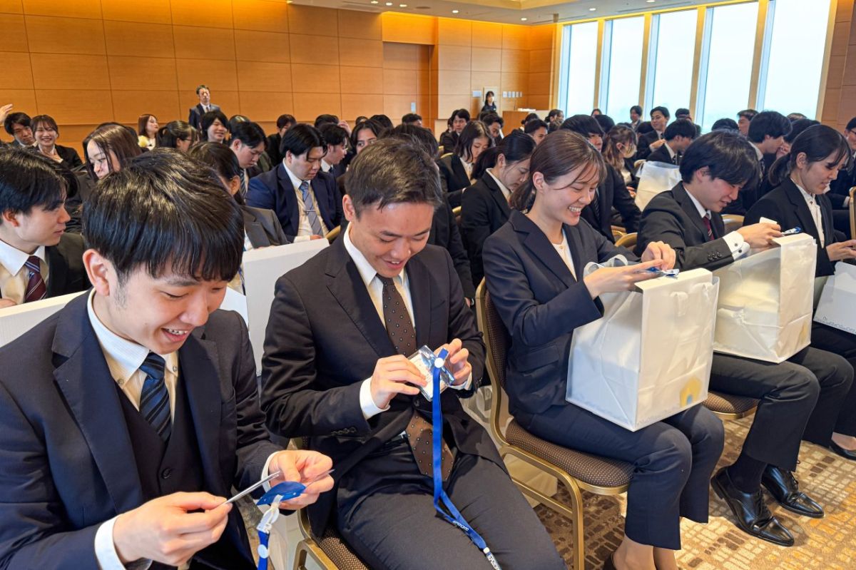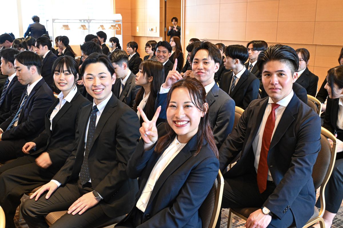 内定者期間中のインターンシップを通じて、すでに強い絆を築いている同期たち。式が始まる前から、あちこちで笑い声が響き、新しい一歩への期待に胸を膨らませている様子が印象的でした。